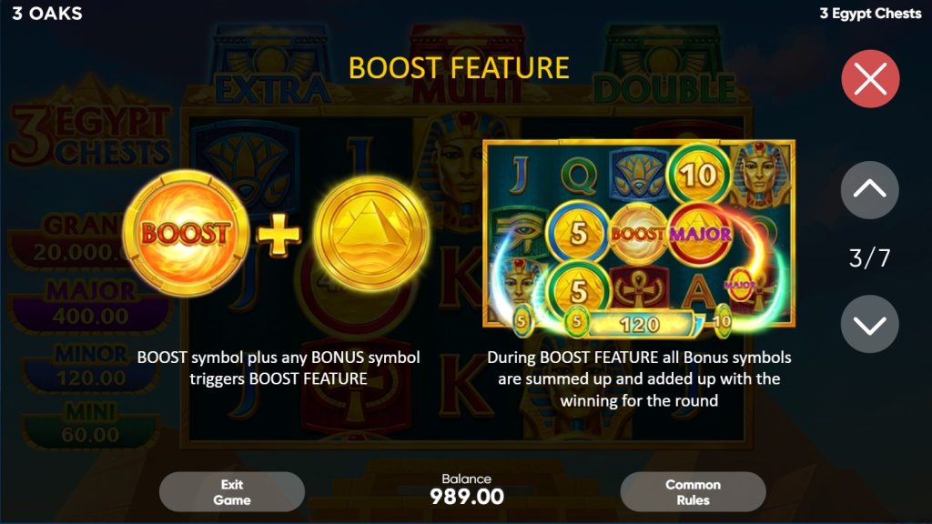 In summary, 3 Oaks Gaming has successfully delivered a slot machine that honors the classic Egyptian aesthetic while providing modern, high-stakes mechanics. From the moment you land your first Chest Wild to the heart-pounding tension of the jackpot respins, 3 Egypt Chests offers a premium gambling experience. Manage your bankroll wisely, keep an eye out for those elusive Boost symbols, and you just might walk away with a pharaoh’s ransom.