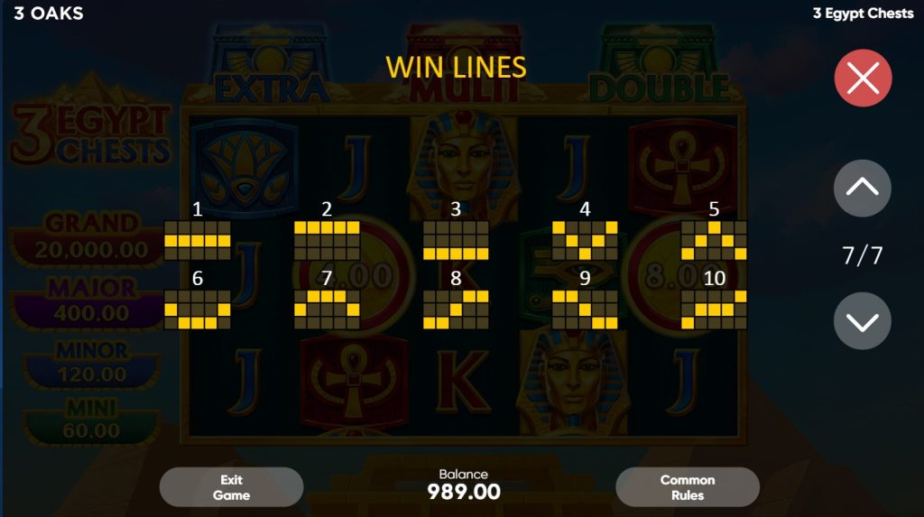 Before you pack your virtual bags for the Sahara, it is crucial to understand the mathematical engine driving the 3 Egypt Chests slot. The game is played across a traditional and easy-to-understand grid featuring 5 reels and 3 rows (a 3-3-3-3-3 layout). Across this classic grid, players will find 10 fixed paylines to form their winning combinations.