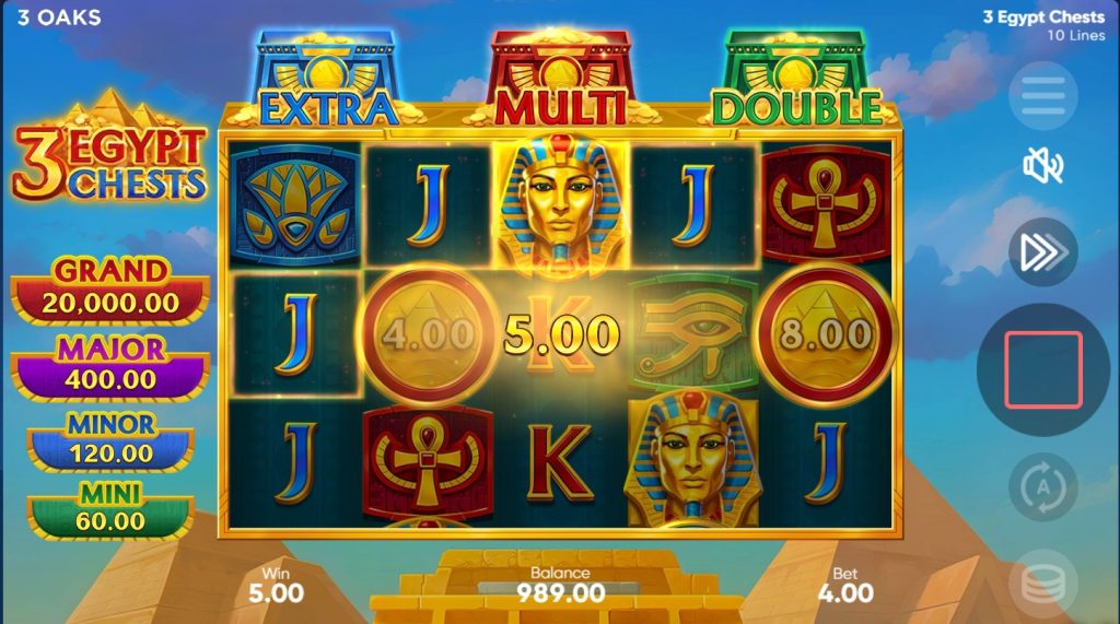For players residing in eligible jurisdictions who prefer to skip the base game grind, the online 3 Egypt Chests slot includes a Bonus Buy option. By paying a premium multiple of your current bet, you can instantly purchase direct access to the game’s main bonus features, allowing for immediate high-stakes action.