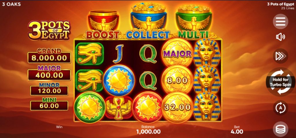 The 3 Pots of Egypt slot by 3 Oaks is a highly competent, visually striking addition to the ever-growing library of Egyptian-themed games. While it may not win any awards for groundbreaking innovation, it executes its core mechanics with flawless precision. The combination of the Hold and Win feature, the dynamic three-pot boosters (Collect, Boost, and Multi), and the four fixed jackpots creates a compelling reason to spin the reels.
