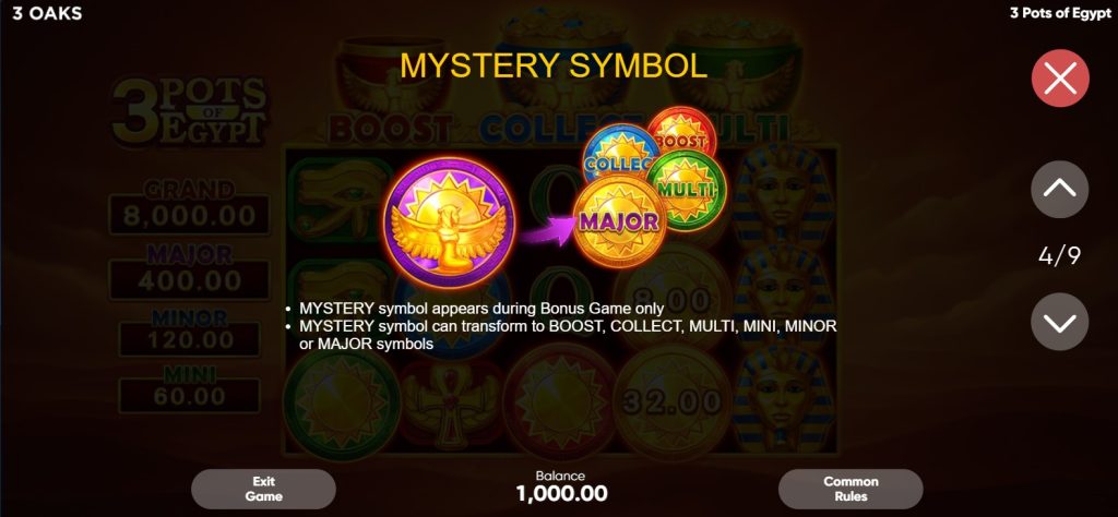 During the bonus round, Mystery symbols can drop onto the grid. These enigmatic symbols will reveal either a Booster (Collect, Boost, or Multi) or one of the highly coveted Jackpot symbols.