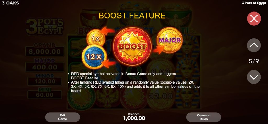 * Boost (Red Pot): This feature actively boosts the values of the existing symbols on the grid, significantly increasing your overall payout potential as the round progresses.