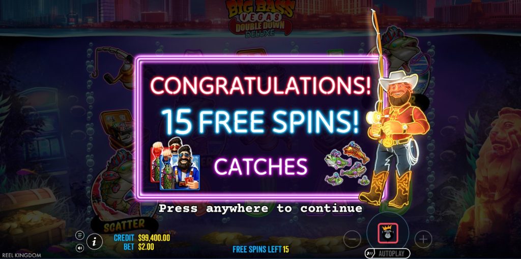 Big Bass Vegas Double Down Deluxe bonus game structure features 4 distinct tiers: Free Spins, Double Wild Meters, Money Symbols, Feature Buy. Big Bass Vegas Double Down Deluxe slot triggers the Free Spins when players land 3, 4, or 5 scatter symbols, granting 15 spins free, 20 free spins, or 25 spins free spins respectively. If exactly 2 scatter symbols land in the base game, the slot occasionally deploys a random hook or respin modifier to pull a third scatter onto the grid, unlocking the free spins free from base game restrictions. During the bonus game, the money symbols display values spanning from 2x to 5,000x the current bet, which the blue fisherman wild and red fisherman wild collect upon landing simultaneously.